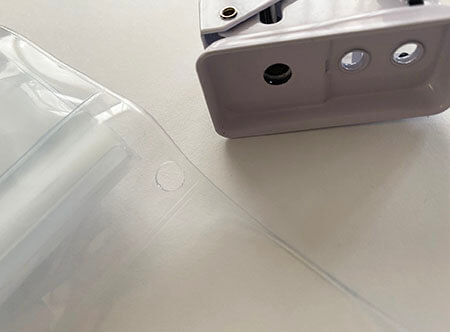 コンパクトタイプは普通のパンチにように上から挟んで使うと穴の位置が確認しにくいのでフタを外して裏側から見ると穴あけ位置が確認しやすくなります