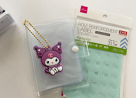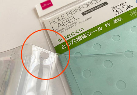 穴をあけた後、そのままでも大丈夫ですが素材によっては穴が広がって破けたりする事があるのでこちらもダイソーの文具コーナーで販売されている”とじ穴補修シール 透明”を貼ると穴の周りが強化されてるので破れにくくなります