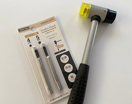 使い方は穴を開けたい場所にポンチを置いて上からハンマーで叩いて穴を開けます、穴の大きさは4mm、5mmですが他のサイズも販売されていました