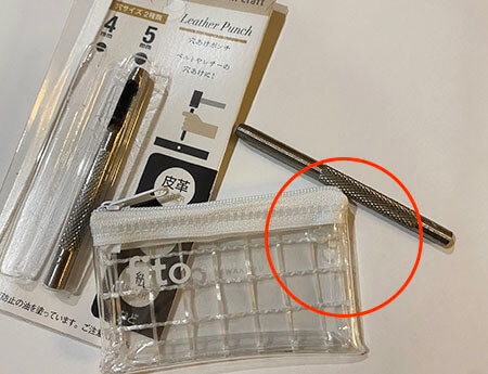 こちらは100均セリアの”ハンドメイド・クラフトコーナー”で購入した「穴あけポンチ」です、穴あけパンチでは穴を開けにく、開けられない皮、布素材、厚みのある物などに穴をあける時に使えます