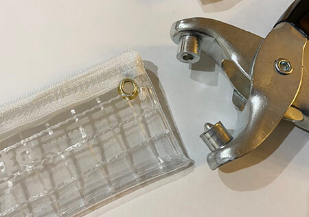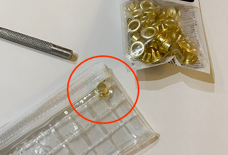 穴をあけた後、保護シールでガードしておくのもいいですがより重たい物を吊り下げる場合などは”ハトメ”をつけた方が安心です