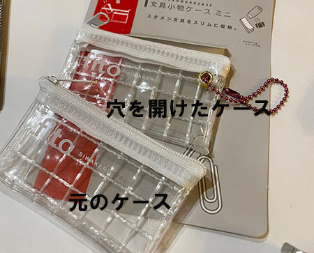 今回はセリアで販売されているミニケースに穴あけポンチで穴を開けてみました、パンチは挟める範囲だけという穴の位置に制限がありますがこちらはないので自由に端でも真ん中でもどこでも開ける事ができます
