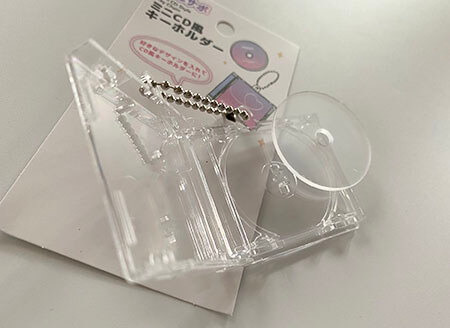 本体サイズは約縦53mm x 縦51mm x 厚さ8mmで本物のCDケースと同じ全面クリアー素材です、購入した店舗では”推し活コーナー”で販売されていました