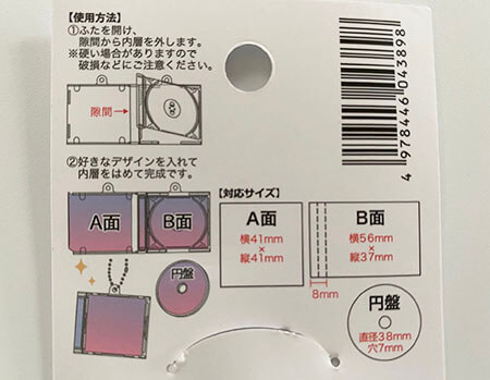 ダイソー キーホルダーCD風表側にプリント・縮小したコピーした物を挟む事は可能ですが、パッケージなどにも説明がないので裏面・背表紙部分は触った感じだと外れないのかなという感じです