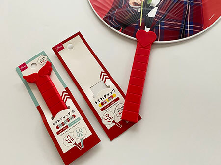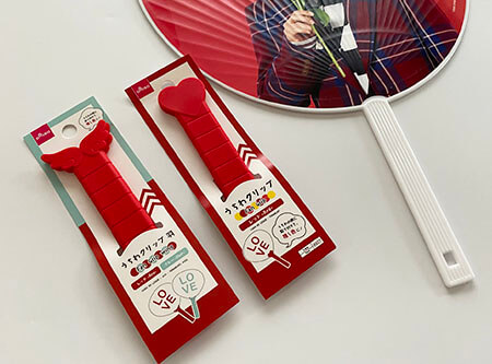 うちわグリップのデザインは2025年11月現在で上部がハート型、羽型の2パターン販売されています、画像の物はどちらも赤ですがカラーは他に”ブルー、ピンク、ホワイト、ブラック、オレンジ、イエロー、グリーン、パープル”が販売されています