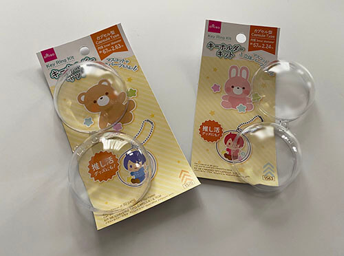 カプセルトイを飾るのにピッタリですが、カプセルはお店に返却するので手元にないですよね、何に入れて飾ればいいか悩んでしまいそうですが、実はダイソーにカプセルそのものではないですがカプセル風キーホルダーを作れるキットが販売されているのでそれを利用するのも手です